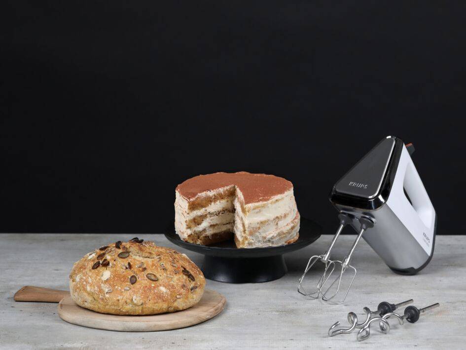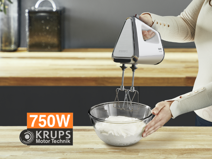 KRUPS' exklusive Motor Technic Technologie liefert einwandfreie Leistungen, auf die Sie sich verlassen können. Mit seinem 750-Watt-Motor und den hochwertigen Metalleinsätzen bewältigt der Handmixer mühelos jede Art von Zubereitung, vom leichten Aufschlagen von Eiweiß, Pudding, Soßen und mehr bis hin zur Verarbeitung zäher Brot-, Pizza- und Kuchenteige.
