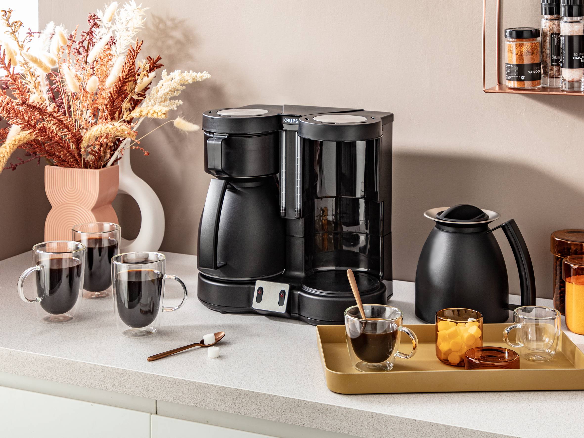 Ein beispielloses Kaffeeerlebnis: Mit der Krups Duothek Filterkaffeemaschine können Sie zwei unabhängig voneinander gebrühte Kannen Kaffee gleichzeitig genießen. Dank eines optimierten Designs bietet diese einfach zu bedienende Kaffeemaschine doppeltes Kaffeebrühen mit einer Menge, die für jeden Anlass ausreicht, und zwei Isolierkannen, um den Kaffee für langanhaltenden Genuss warmzuhalten. Eine große Auswahl an praktischen Funktionen, die für müheloses Kaffeebrühen entwickelt wurden, runden das perfekte Kaffeebrühpaket ab.